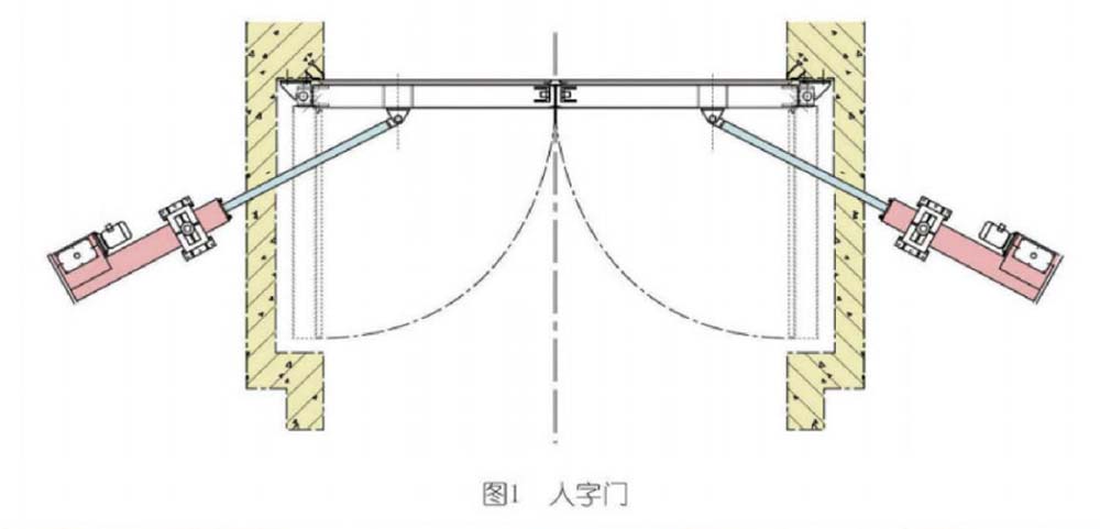 人字閘門分為左右兩扇門葉分別繞水道邊壁內的垂直門軸旋轉,關閉水道時,俯視形成“人”字形狀的閘門。